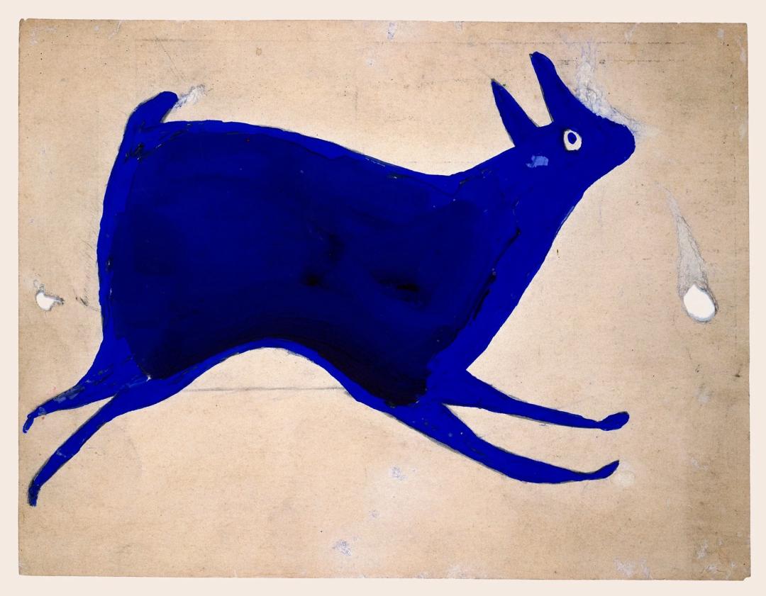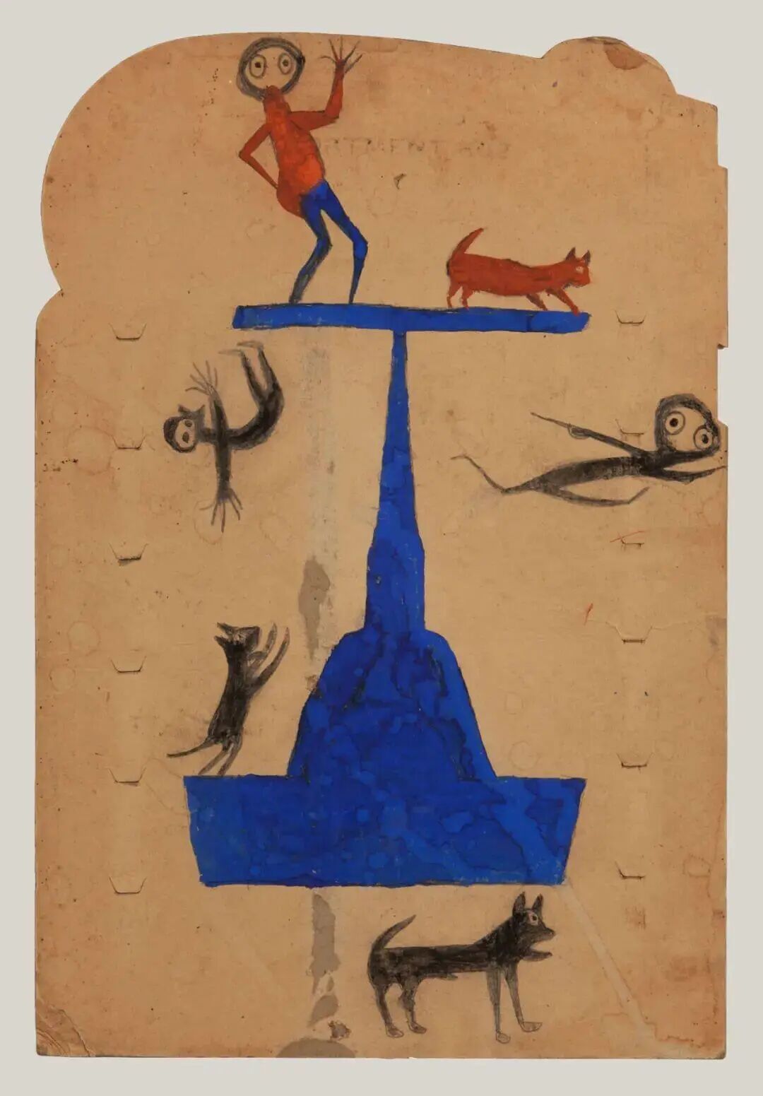 1939年,年届85岁的特雷勒在蒙哥马利市的街头,开始用捡来的纸板、水粉颜料和铅笔进行创作。没有正规艺术训练的背景,却让他摆脱了学院派技法的桎梏,以最本真的视角观察世界;底层生活的积淀,则为他的作品注入了厚重的现实底色。1939至1942年是他的创作黄金期,《奔跑的蓝兔子》便诞生于这一阶段,成为他对生命、自由的直观诠释。