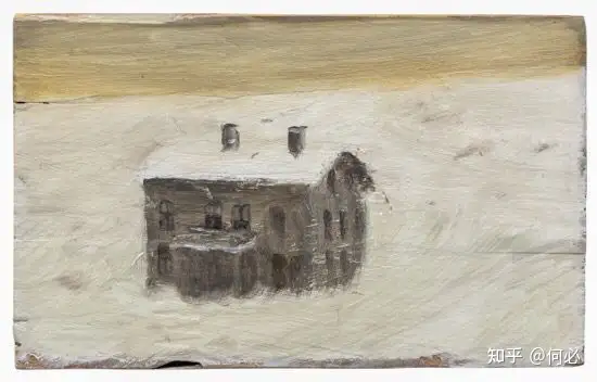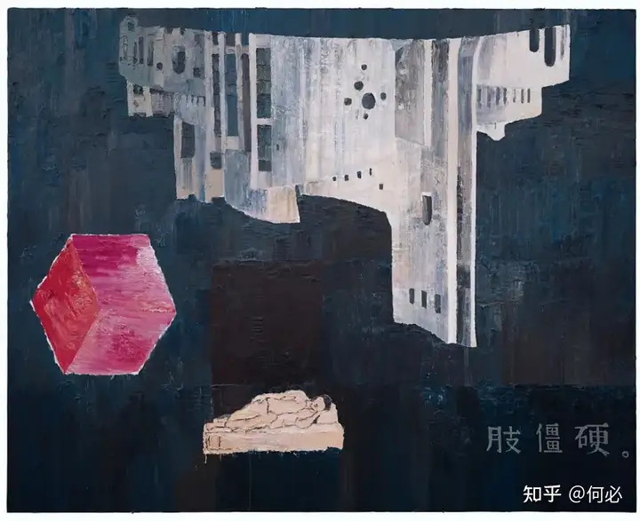 此时,仇晓飞不再专注于重建自己的“记忆”,画面开始具有了更多的隐喻。比如他会借用一些寓言式的图像来表达一种精神上悬空的状态:在2009年创作的《肢僵硬》这幅作品中,倒置的社会主义建筑,孤独的躺在床上的个体,被隐去形容精神病人“四肢僵硬”状态的“四”字,只留下“肢僵硬”这几个字,使画面变得不明所以等等。