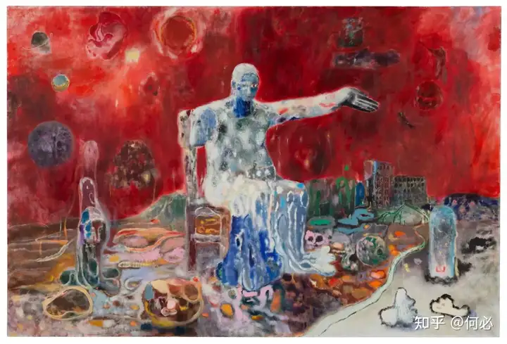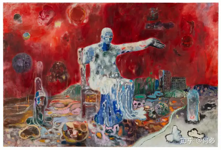 在这幅全新的创作中,仇晓飞重新刻画了这个形象。同时,画面那炙热的红色背景,具有隐喻性的墓碑、星球等等,似乎同时象征着死亡与新生。