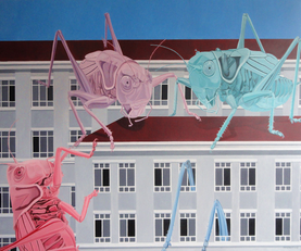 此幅作品距离创作已经过了挺久,画了也挺久,繁复的细节表现很耗时间,巨型蚂蚱与蚂蚁的组合觉得挺有意思,背景有机械,这也是一种喜好,困的主题,在之后的创作中还会常有涉及。