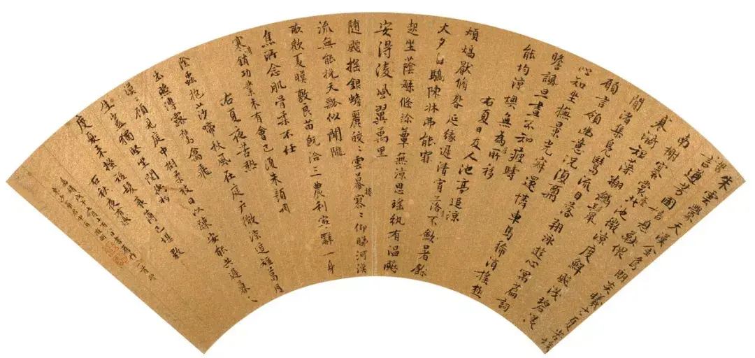 文嘉工小楷书,得父亲真传,詹景凤评其“轻清劲爽,宛如瘦鹤”,尤其在晚年书法奇进,不减文徵明风采。本幅上半部虽画有乌丝栏界格,文嘉却以行草书夹杂抄录白居易《琵琶行》全文,显然以迅疾为主;又由于文派书法喜用尖锋硬毫,尤以小行草为然,故有“锋芒削利”的刻板印象。文嘉虽已是古稀之年,却是艺术表现趋于成熟之时,对“琵琶行”此类主题并不陌生,甚至可说十分熟练。