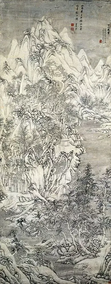 明 文伯仁《四万山水图轴》之《万山飞雪》《四万山水图》指的是四幅分别以“万壑松风”、“万竿烟雨”、“万顷晴波”、“万山飞雪”为题的画作的总称。各图都描绘了文人的闲适,在整幅画中大量使用了一种名为“清劲”的白描笔法,表现密度极高。本图是文徵明的侄子——文伯仁为友人顾从义而画,作于文伯仁50岁时。各图上有明末艺苑的代表文人董其昌所题的画赞。本作品是嘉靖年间(1522~66年)吴门画派的代表作品之一。