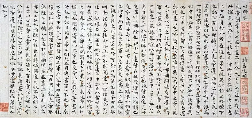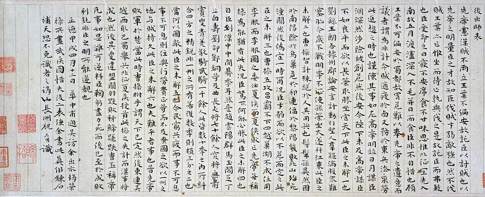 祝允明书《前后出师表》卷,是祝允明55岁(1514年)时写的小楷书法作品,现收藏于日本东京国立博物馆。这幅作品所写的内容是三国时蜀国著名政治家、军事家诸葛亮的千古佳作《前后出师表》,形式上用乌丝栏界格把字隔开。