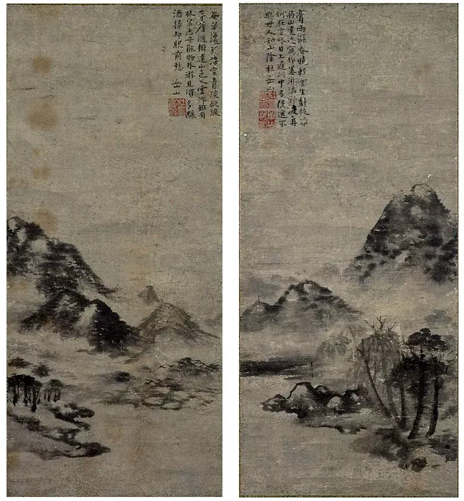 此画作者不祥,从画幅上明洪武年间(1368-1398年)任休宁知事的杜贯道的选来推测,制作时间当在明初。此作是元末明初的米法山水中的知名佳作,因由两幅山水图拼成,故被称为“离合山水图”。
