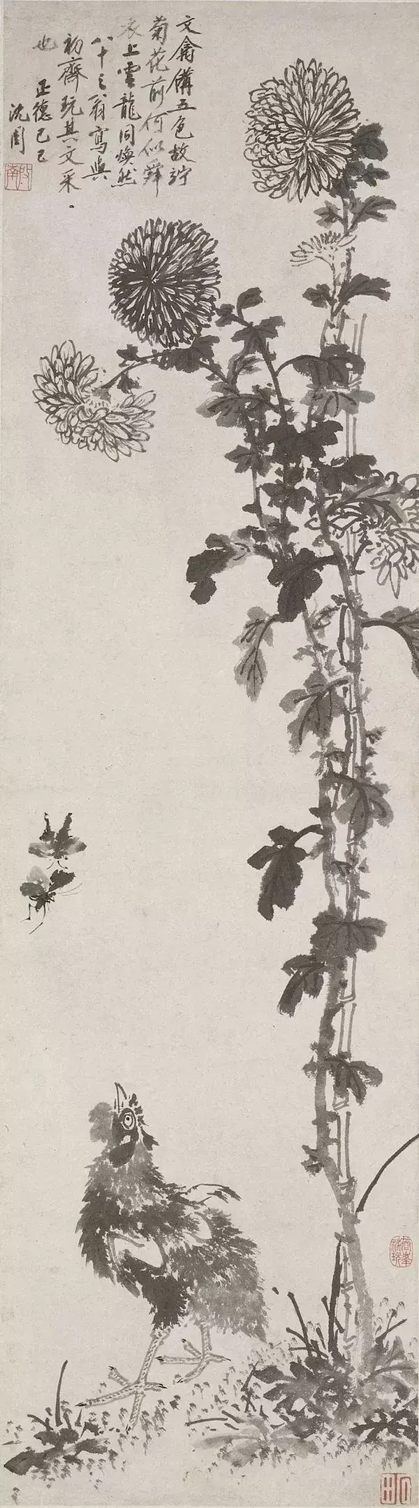 《菊花文禽图》是沈周此类精准掌握写生之妙的立轴作品,水墨淋漓,生动自然。画中菊花掩映,摇曳生姿,菊茎缠绕竹枝而上,浓淡墨色暗示枝叶的水分饱满。菊下公鸡回望空中飞蝶之势,也令人想起崔白秋兔之姿,带入宋人画意。沈周的花鸟画兼有宋元之长,影响了明清两代文人写意花鸟画的发展。