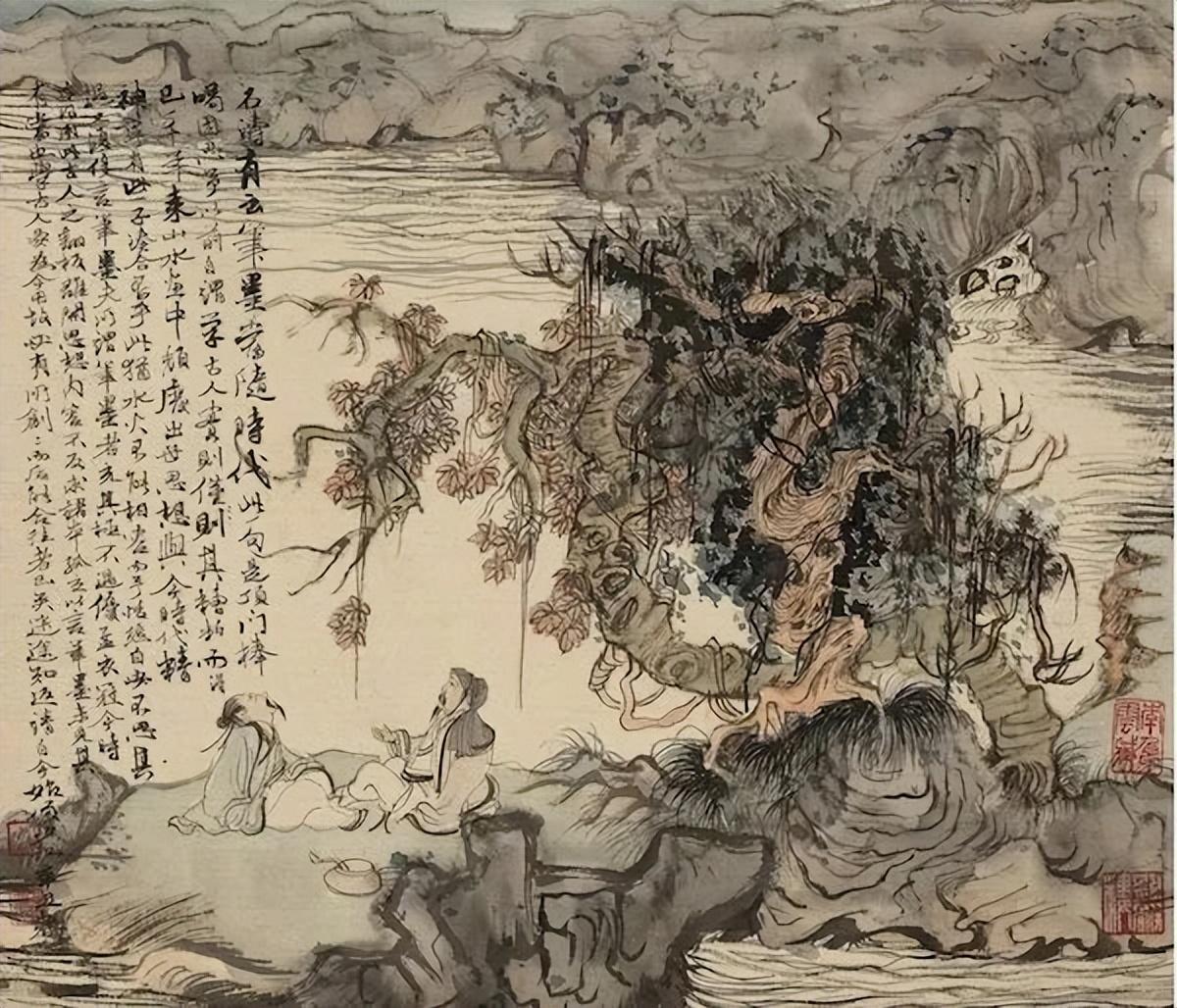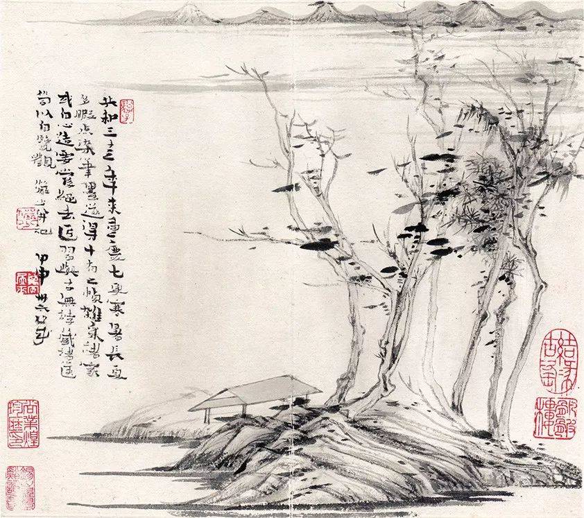 但这种书写性并不脱离山水形象的具体刻画,反而更加讲究墨法,湿笔勾点大大增多,出现了点厾的大小墨块,这些墨块可以是山石,可以是草木,可以是阴影,也可以是半抽象的笔墨自身。因为突出了用墨,减少了锋芒外露的干笔勾画,整个作品的笔墨由缜密精致变为松厚丰润,成为风格转化的一大特点。“留白”更加成熟,成为画面结构的重要部分,在对山石、林木等具体描绘后,在周边留白,以突出主题,强化虚实。