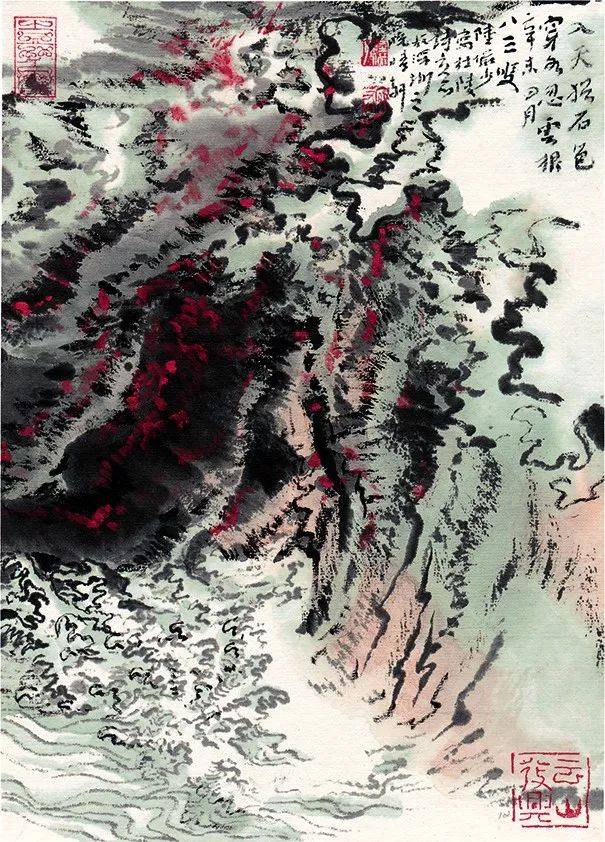 陆俨少中期的笔墨有充分的发挥,但独立的意味还不够强,也不够浑厚、松。晚年的笔墨浑厚、松,天真烂漫,与晚年多用大笔头有关,但主要是墨色饱满与笔力雄强带来的,粗服乱头、乱而不乱,随心所欲,笔、墨之间加点石色,将笔墨与点彩结合起来,给画面增加了新变化。其山水画的笔墨新意境,是基于深厚的传统学养和对生活的深切感受之后的创新,集中表现在他画云水、墨块和留白上。