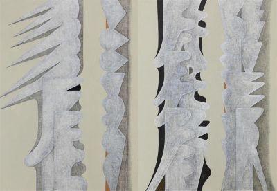 017年至2019年,卜镝常将绘画利落地一分为二,仿佛划开台前与幕后。割开的两块领域内,齐整少见,多是扭动的塑形和镌刻,线条和块垒都有思想心跳。若干年的创作排开来,模样相近的图像几番浮现,像是客串戏剧的演员们,装束台词不同,脸还是那一张。反反复复,卜镝想接近它们,描摹它们折射的轮廓。他研究诸多视觉资源:佛教美术、20世纪初西方前卫雕塑与绘画、传统书法,甚至新现实主义电影,不可尽举——那些画的背后潜藏着一方池塘,池深不见底,沉重低回处,模糊的图式浮现便熄灭。于是,艺术家不曾冒进地将图像提炼成图式。他的成就立足于对历史和周遭的判断:无论怎样虔敬地切慕,绘画无法触及确定和真实的全景,顶多只能留住一个角度的光影片段;当走得无法前进,必须折返,保留杂乱或烦恼,伺机再出发。比起一往无前的狂想,求是的谨慎更需要勇气。这恰是现代主义艺术给21世纪中国画家留下的进展空间。