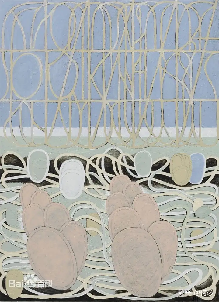 画面主体为堆砌的椭圆形,受到布朗库西作品《沉睡的缪斯》启发,用以表示女性身体,背景则是一片通红,底部一指宽的米色当初涂了三十来遍,从侧面看厚厚一层,就为了试什么与红色最配,“必须得到画板上试”;另一张《赋格4毕斯马花园》,同样是致敬擅长演绎巴赫的大提琴家,他想让主体的灰色发出仿佛是透了层玻璃纸的亮,“调了好多遍,加粉加绿,最后结合这个颜色和线条的关系,才能把我想说的话、看不见的东西,和想象他在天堂里形象的综合美感表达出来。”