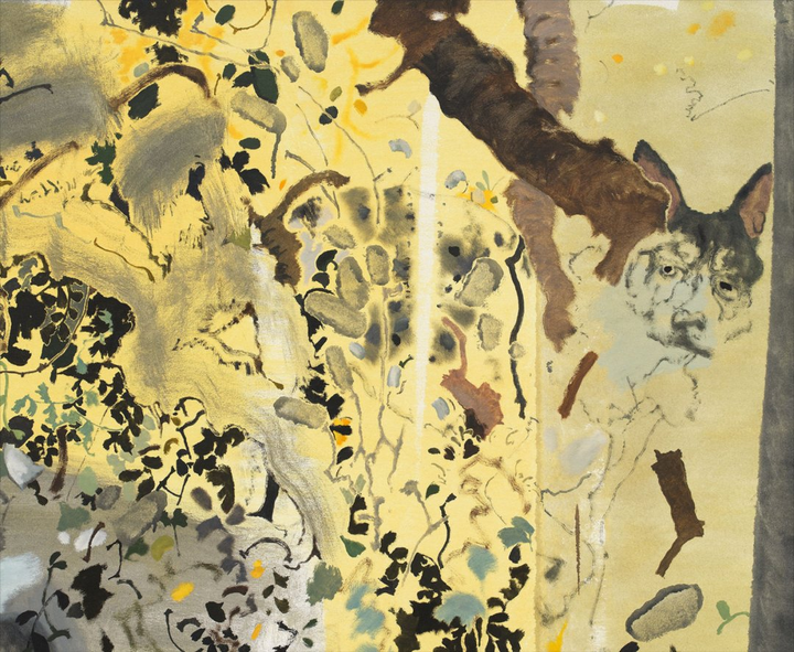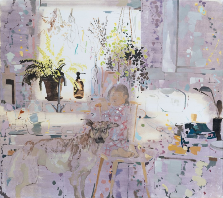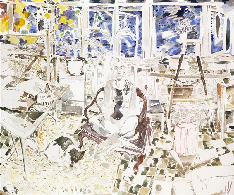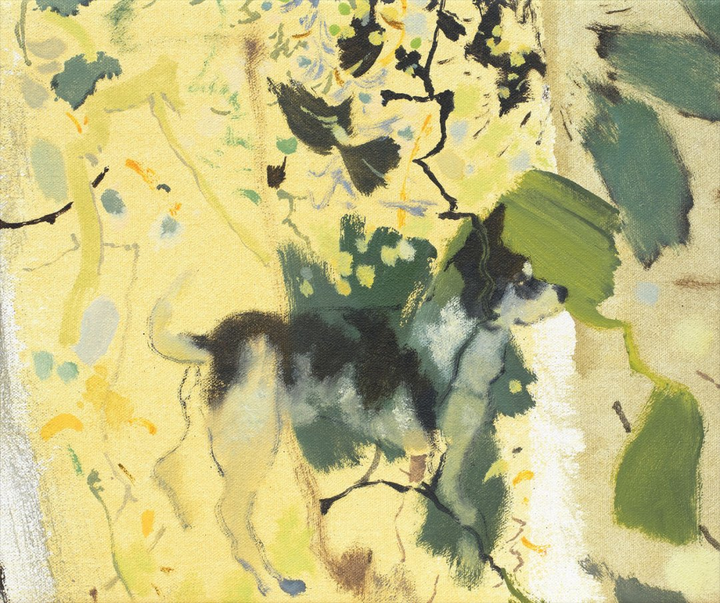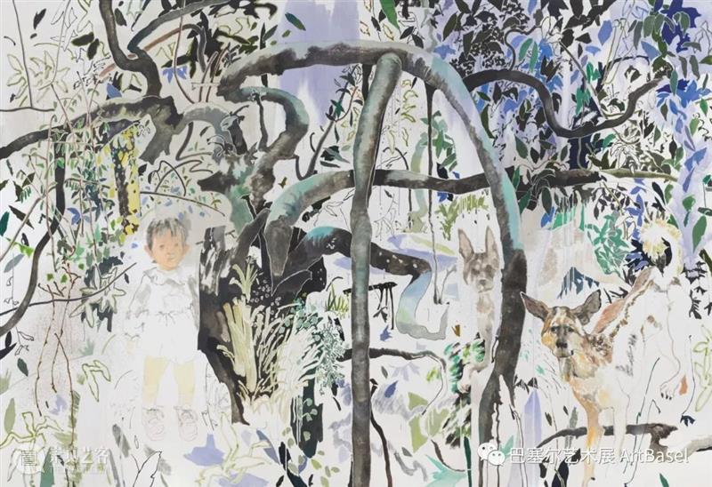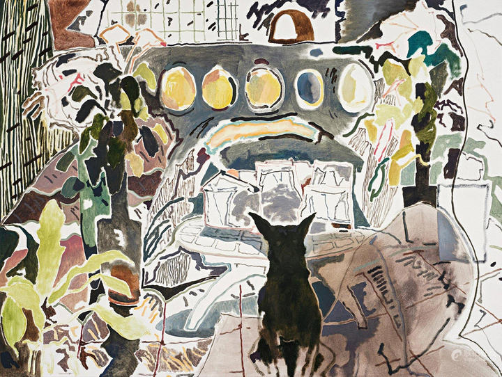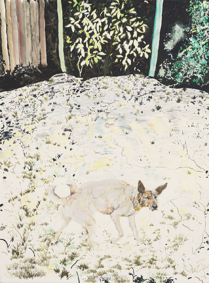 艺术家最近搬到了伦敦,这显然对他的实践产生了影响。他最近的水彩画和大型油画中的风景唤发出全新的生机。禤善勤将这归功于他每天与家人和狗在公园的散步。这种反复出现的角色也几乎出现在这位艺术家所有作品里。他说:“我有一些作品没有包含我的家人,但那些作品总会让我觉得有些地方不对劲。我发现描绘家人是我艺术创作的锚。”艺术家也思考对熟悉事物的观察:我们每个人,无论是人还是动物,是如何感知世界的? 《MuiMui and Balltsz》(2021),禤善勤,图片由艺术家及Simon Lee Gallery提供
