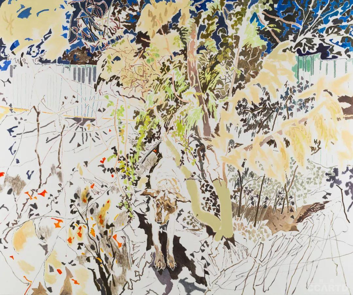 这位香港出生的艺术家所呈现的日常场景是熟悉的、无拘无束的、由直觉所形成的。作品运用了中国水墨的层叠技法,同时也借鉴了西方的抽象手法,坚定地处于不同世界和各种文化之间——不论是现实的,还是记忆中的。 《Tess, Balltsz and MuiMui》(2021),禤善勤,图片由艺术家及Simon Lee Gallery提供