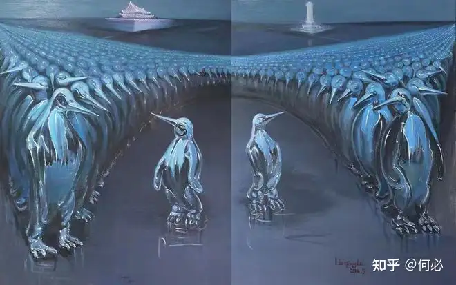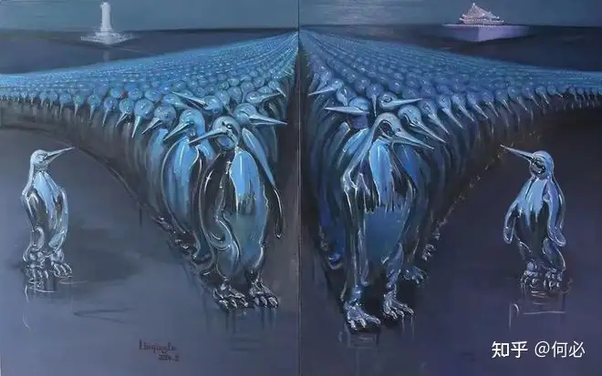 我们可以很直观地从他的画中看到,企鹅--可爱又神秘的这一形象会频繁出现。这是刘清路画中的艺术符号之一,很多人都会问他这样选择的缘由,他也只是简单介绍一下,有人说,他画的不是‘企鹅’,是自己,让每个人能够以局外人的方式去看清自己。