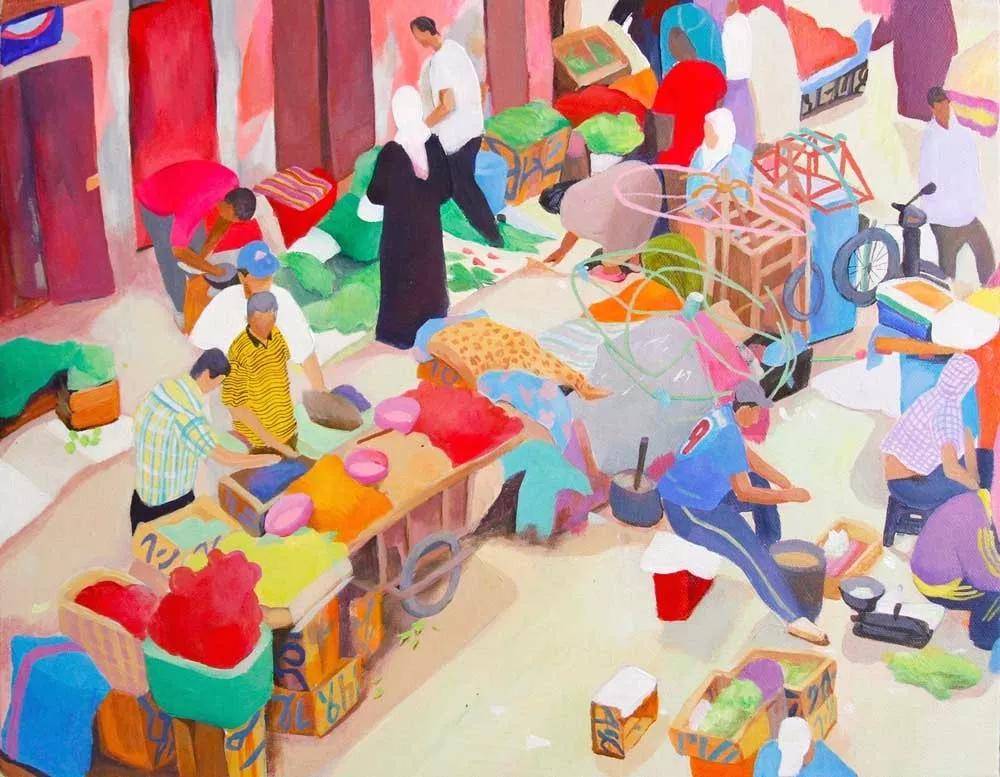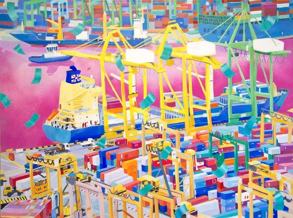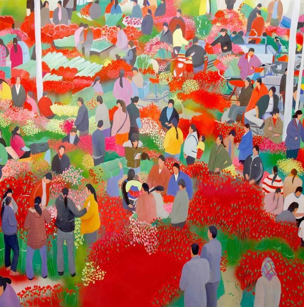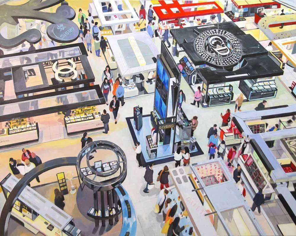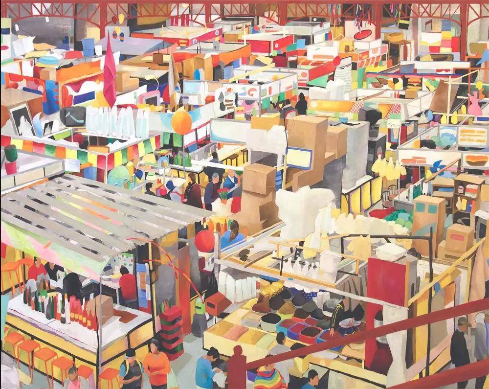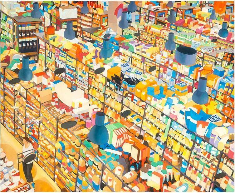摆满商品的商场货架、玲琅满目的菜市场、俯视视角下充满流行元素的游乐场、正在紧张施工的大型工厂车间……这是刘溪子笔下的艺术世界,也是她所看到的现实消费社会。对于大部分人来说,很熟悉,就在身边,却有一种陌生感,因为我们很少停下脚步去凝视这些场景。