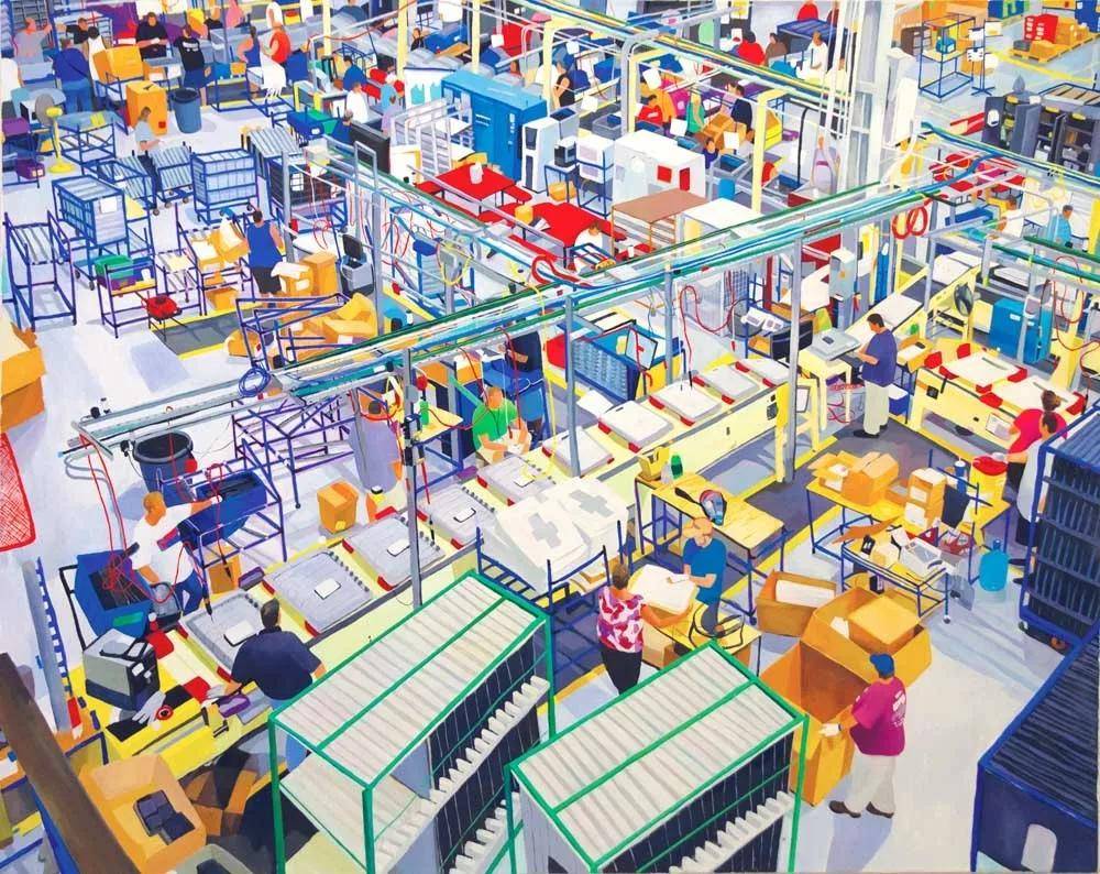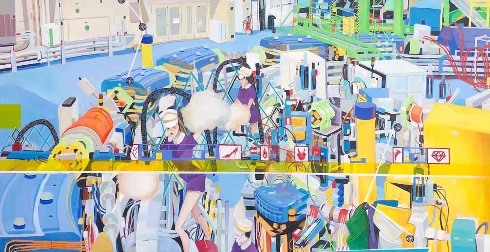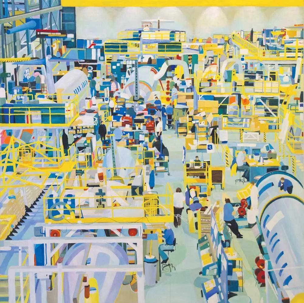 从题材角度来看,工厂其实是消费社会的起源,是生产消费社会产品的地方,是一切消费社会物品的起源,它们既是大宗商品的生产地,也体现着劳动力的生产,还是反应国家经济发展的象征,我觉得这些消费社会的元素在工厂中都有体现,我之前也画过很多工厂车间,画过波音制造工厂、电脑制作工厂、电视制作工厂……这和我的创作也是一脉相承的。