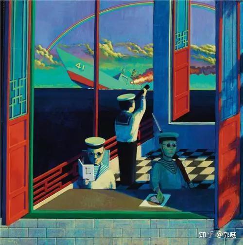 ▼刘野和他的“红” 1994年回国后,刘野的创作风格和题材都做了相应转换。合唱团、舰队和水手男孩走进了他的画里。大面积的红色引人注目。
