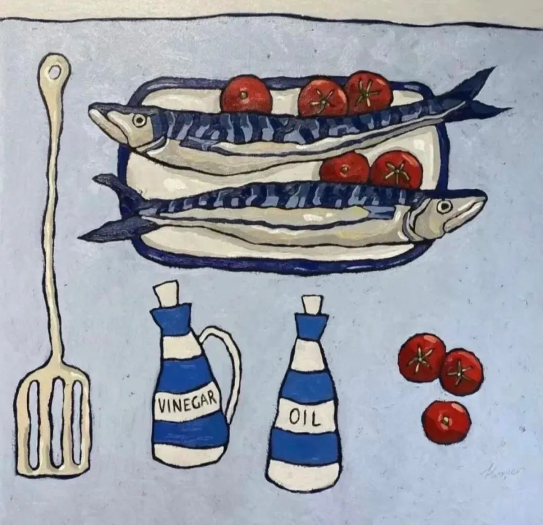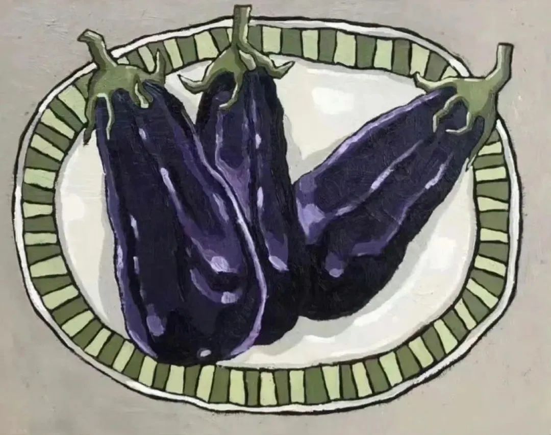 不同于传统静物画对细节的精雕细琢,她的画面以近乎孩童涂鸦般的率真笔触,将陶罐、刀叉、面包篮等元素简化为几何化的色块拼贴。草莓和番茄的橙红色块与青椒的翡翠色形成撞色交响,深褐轮廓以粗黑线条勾勒,仿佛从童话书页中跃出的二次元符号。这种介于稚拙与成熟之间的矛盾表达,使她的作品既带有印象派式的色彩狂欢,又透出波普艺术的平面张力。