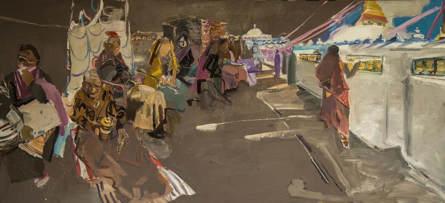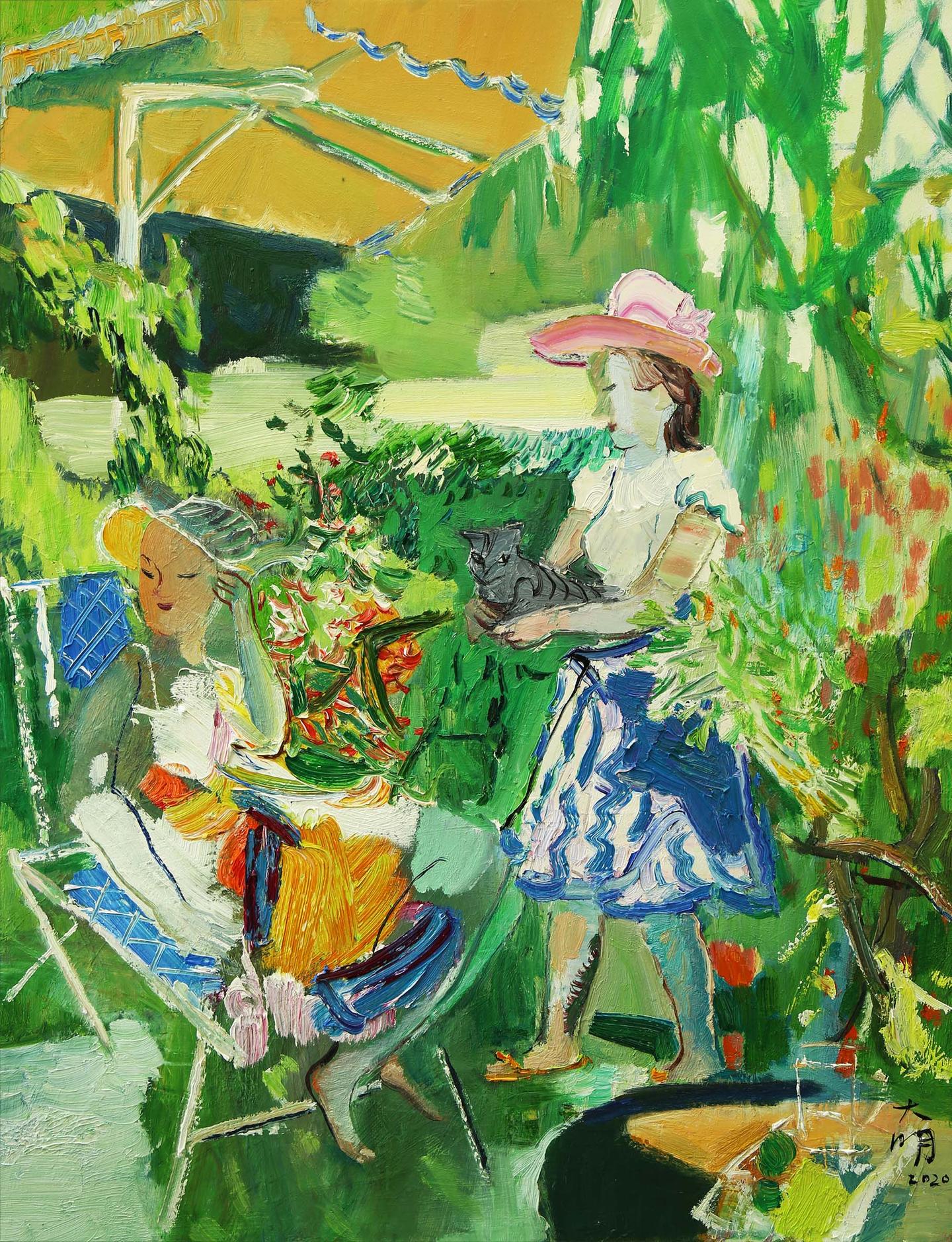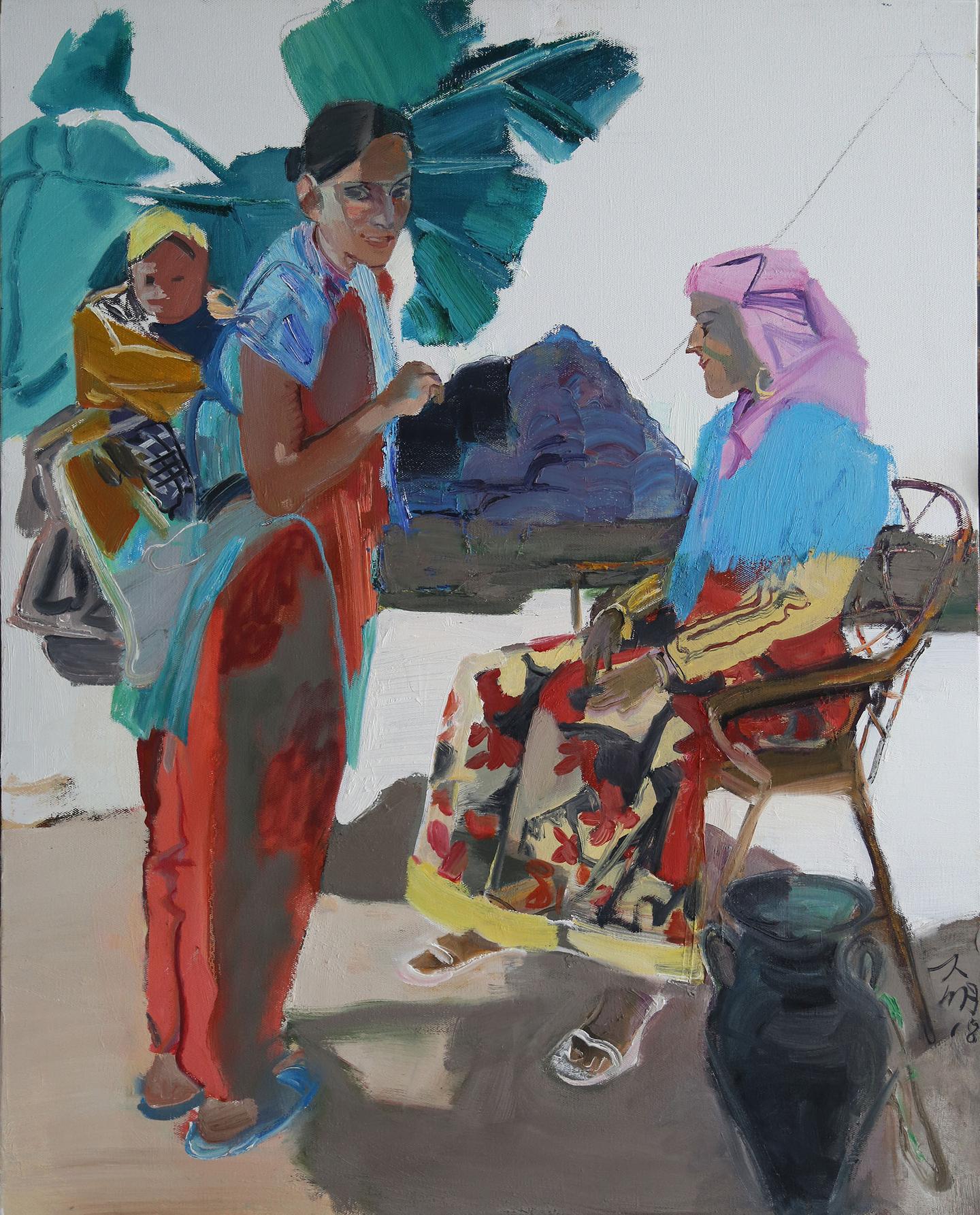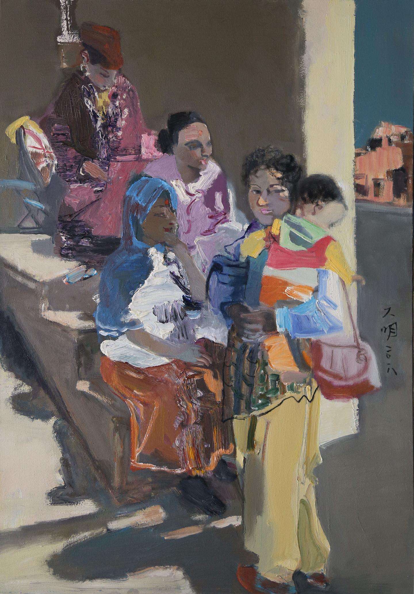 艺术家建立起作品中“意”与“像”的主客体关系或者说是“意”与“形”的逻辑关系是实现中国写意油画样貌的重要思想路径。这是中国传统哲学和美学精神通过油画语言进行再发现与再创造的一种表达形态。“意”的建构是作品的精神实质,也是作品的思想核心。《吐鲁番的葡萄熟了》《向海》《金色稻田》《春天的花园》等作品是刘大明教授对身边熟知生活发出的一种礼赞似的动意,这种“意”的出现是艺术家积极的生活态度的反射,是艺术家对美好生活家园诗歌般的颂唱。这种自觉性的动意是艺术家情感的真实呈现,也是艺术家内心无比纯粹的真实反映。《尼泊尔的朝圣者》《玛拉迪卡的女人》《巴塞罗那盛夏》《摩纳哥海滩》等作品是作者游历时触景生情的意欲,这种“意”生成了艺术家对人性光辉的感慨和急切想要表述的欲念。在这些作品中可以看到刘大明透过平淡无奇的街路、休闲时光里的人们、朝圣路上的行者等等目光所及之处对诸多异域人群日常生活的情愫关怀,刘大明意欲通过这样的场景表达其对人类精神美好共性的向往。在赏读这些作品的时候我们会发现刘大明在画意背后流露出了对绘画形式语言的新追求,也就是说刘大明在他绘画的“象”或“形”的问题上有了新的自我架构。熟知刘大明油画的人会有这样的感受,其早期带有强烈色彩关系和泼辣笔触的表现性绘画样貌在这一阶段发生了不小的转变。一是画面用色紧随其形,画家逐渐从以往象征性和主观性色彩解构中回归到现实视觉,这种现实视觉态度并非传统写实性色彩的回归,而是作者不断从画意之中提炼出具有更为理性的全新的色彩逻辑,这种理性的全新的色彩逻辑是画家追求笔墨达意的更高境界。二是画面用笔更加具有中国传统书写的特征,如果说刘大明早期作品中具有强烈表现性笔触特点的话,那么近期作品中对线性塑造力的关注以及线条表现力的锤炼则更加富有东方文化精神的意蕴。由此看,刘大明在近作中其用笔用色皆已从表现性绘画语境中蜕变到极具中国传统精神的视觉经验里,而这种视觉经验的建构无疑和他作品的意境形成了高度的契合。