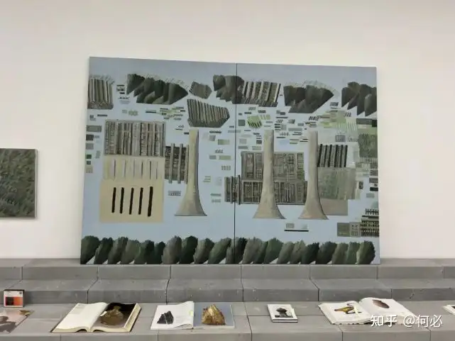 单独摆放时并不起眼的灰砖一来为了致敬极简大师卡尔·安德烈(Carl Andre,曾任铁路制动员,认为无装饰的材料本身就是艺术雕塑),卜镝吸取其任由枕木、砖头、铁块自然表现以及用不加工的方式带来美感的做法,整齐堆叠后的砖墙自成一派,不仅传达出庙堂感和建筑基座的威严,砖的肌理有时还能和画中的线条相呼应,形成搭配;功能上既能搁画,“画板不是挂在那,是戳在那。像长出来的,好像可以随时挪动”,又能搁书,第二个展厅里沿墙搭砌的基座上摆满了书,卜镝说那就是他的“学习之路”。