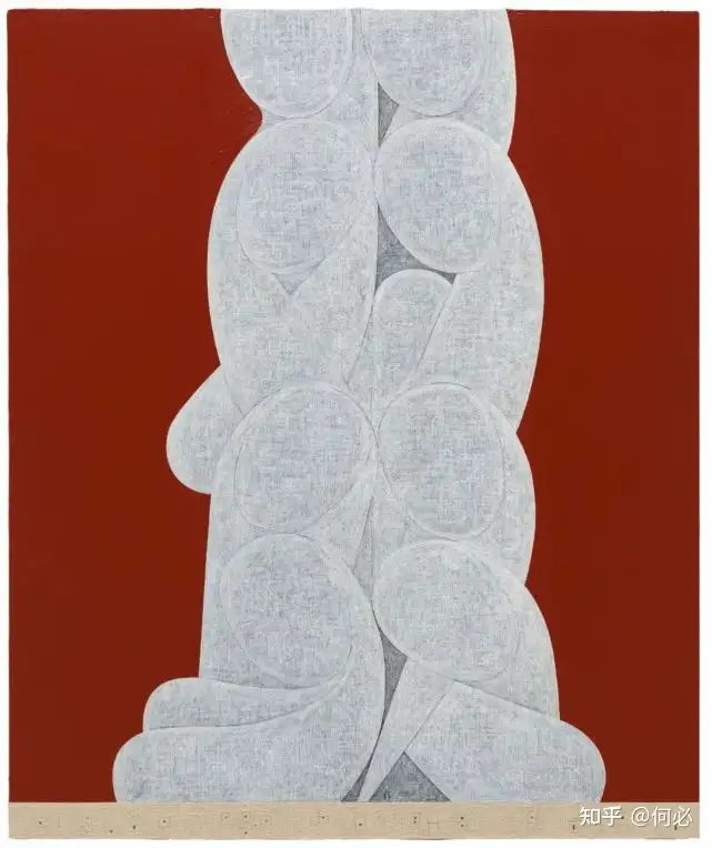 画面主体为堆砌的椭圆形,受到布朗库西作品《沉睡的缪斯》启发,用以表示女性身体,背景则是一片通红,底部一指宽的米色当初涂了三十来遍,从侧面看厚厚一层,就为了试什么与红色最配,“必须得到画板上试”;另一张《赋格4毕斯马花园》,同样是致敬擅长演绎巴赫的大提琴家,他想让主体的灰色发出仿佛是透了层玻璃纸的亮,“调了好多遍,加粉加绿,最后结合这个颜色和线条的关系,才能把我想说的话、看不见的东西,和想象他在天堂里形象的综合美感表达出来。”